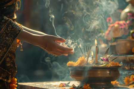 Indian Woman Holding Incense and Flowers for Rituals. Concept of Cultural Traditions, Spiritual Devotion, Hindu Festival Celebrations, Aromatic Offerings.