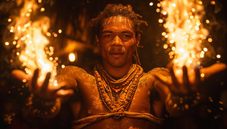 A man performs a tribal fire ritual with glowing sticks, his expression serene amid the intense warmth and light.