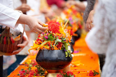 A priest arranging the decoration of worship ritual of hindu god and goddess in a sacred temple in Bali, Indonesia
