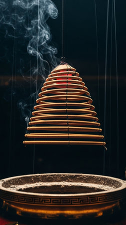 A high-impact, vertically oriented stock photograph showcasing a large, burning spiral incense coil