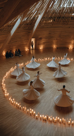 A group of dervishes perform a traditional whirling dance in a softly lit, wooden interior. They wear flowing white gowns, with a circle of candles illuminating the wooden floor. The composition suggests a focused, spiritual event, likely performed indoors with warm, natural lighting. Suitable for editorial and commercial use.