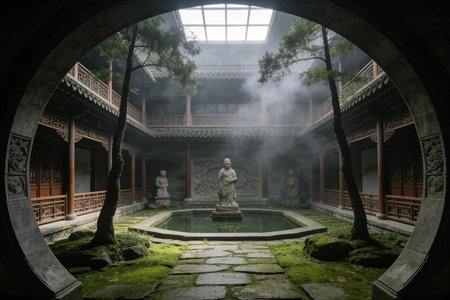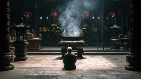Concept photo of a lone pilgrim sitting in contemplation at the base of the shrine, surrounded by fragrant incense and the tranquil atmosphere, lost in deep thought and connection wit