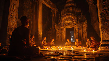 Experience the serene and tranquil atmosphere of monks deep in meditation inside a centuries-old temple bathed in the soft glow of candlelight Find inner peace and spiritual harmony in this captivating work of art