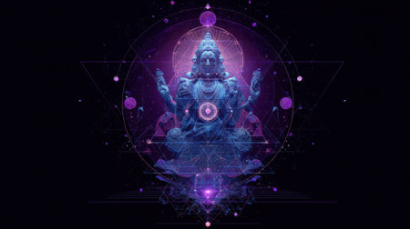 Mystical cosmic deity: spiritual hindu figure in ethereal geometric design.