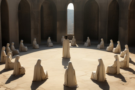 Buddhist monks meditating in front of a church, 3d rendering