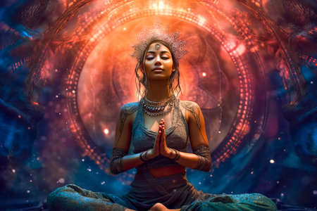 illustration of Indian woman meditating sitting in lotus pose. generative AI.