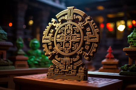 a wooden sculpture of an aztec design on a table