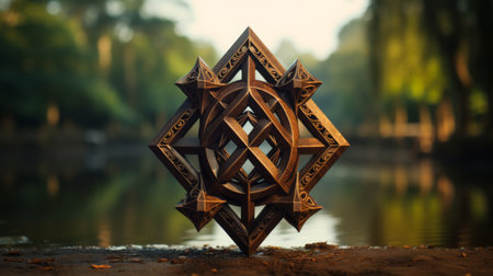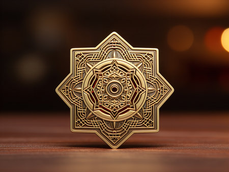 A complex geometric star symbol, rendered in metallic gold and deep blue, dominates a dark background. The image features a symmetrical, detailed design with a radial composition, suggesting a sense of depth and dimension. The use of light and shadow creates a dramatic effect, suitable for conceptual and artistic applications.