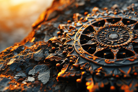 A detailed view of an ancient stone artifact featuring a sun motif, beautifully illuminated by the warm light of a sunset in a serene garden.