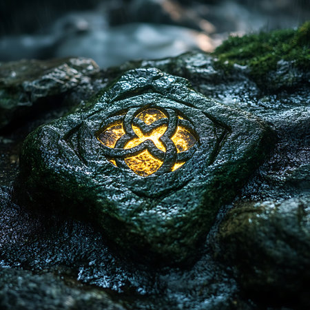 A captivating stone surface featuring a detailed symbolic design, illuminated by gentle firelight, nestled within a serene forest environment.