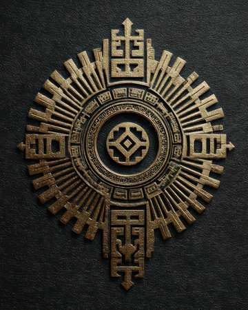 A detailed symbol set against a dark textured background, blending ancient and mystical elements. The design features geometric shapes and intricate patterns that evoke a sense of spirituality and mystery.