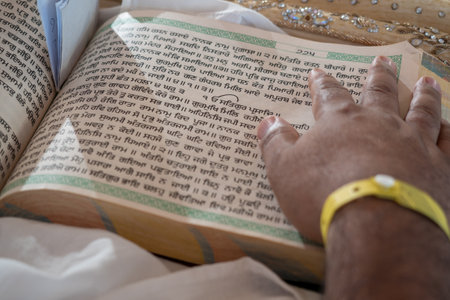 A closeup of a man reading the Granth Sahib for a traditional Indian wedding ceremony