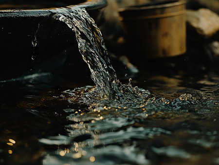 Water pours into a small bowl, generating gentle ripples on the calm water surface in a peaceful setting, evoking tranquility and mindfulness.