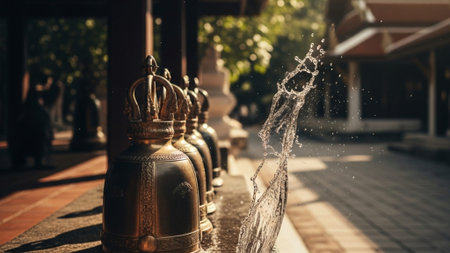 A panoramic, cinematic wide shot capturing an antique bronze temple bell still life setup (Songkran