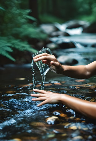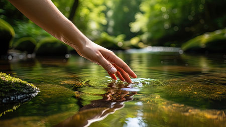 A serene moment captured with a hand reaching out to catch clear water from a stream, surrounded by lush greenery. This image evokes feelings of tranquility and connection to nature.