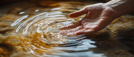 A hand gently touching the water's surface, creating soft ripples and catching the light, symbolizing peace and tranquility.