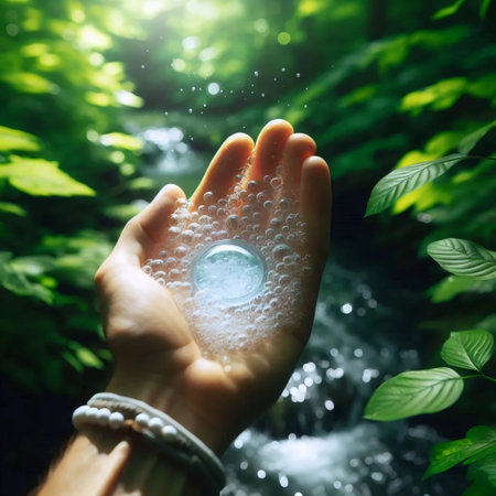 A serene image of a hand reaching out to catch sparkling water droplets, capturing the essence of nature and tranquility in soft lighting.