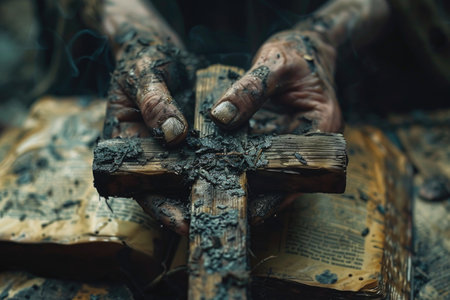 Crucifix made of ash and dust as a symbol of Christianity, Jesus, god, faith, holy day, holiday, concept background.