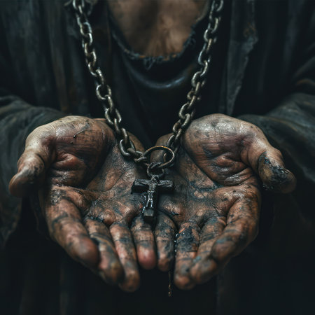Close-Up of Dirty Hands Holding a Rustic Cross in Chains, Symbolizing Faith and Struggle.