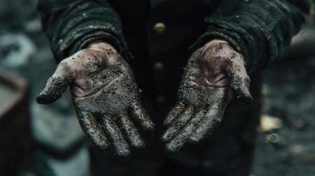 Close-up of open dirty hands with dry mud and textured grime. Ideal for storytelling about manual labor, life challenges, survival, farming, and authenticity in rustic settings