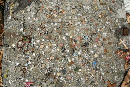 The picture from the hill of crosses by Å iauliai in Lithuania. The detail of one stone with the coins and religious icons from the pilgrims.