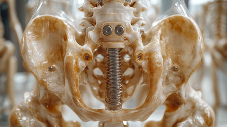 In clinical setting, closeup of pelvis in human skeleton model positioned for osteopathic assessment in empty medical office. Sideview shot of pelvic bone structure in vacant hospital room.