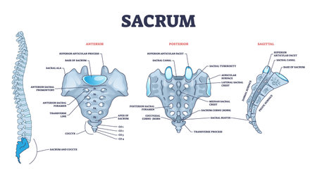 Sacrum as spinal bone structure anatomical description outline diagram