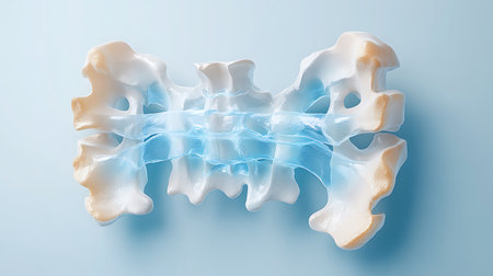 A detailed anatomical model showcases the human spine emphasizing the vertebraes structure and alignment. The model illuminated against a white background highlights the curvature and the distinct characteristics of each vertebra