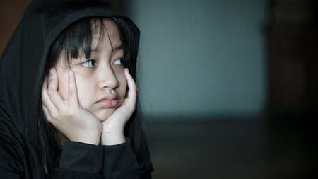 Sad lonely little girl crying while sitting in dark room with an attitude of sadness.Concept of depression or domestic violence child