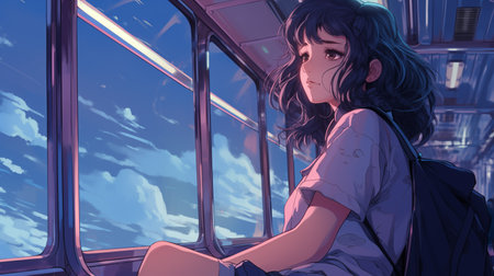 Anime girl deep in thought, looking through train window ai generated 2D cartoon illustration. Commuter train lofi wallpaper background lo-fi art. Daydreaming passenger flat image cozy chill vibe