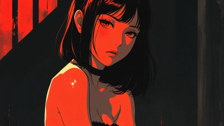 A stunning anime-style portrait of a dark-haired girl bathed in intense red lighting, creating a dramatic and mysterious atmosphere.
