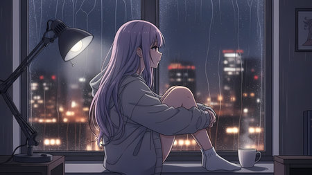 Illustration of a sad girl sitting on the window in rainy day
