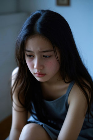 Sad lonely girl crying while sitting in dark room with an attitude of sadness.Concept of depression or domestic violence child