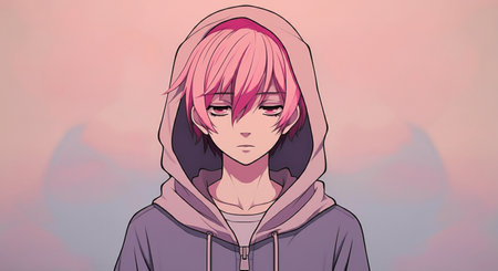 AI Generated. Stoic young man facing challenges with unwavering resolve Inspirational outdoors Lofi Lofi, dark purple, pink, dark blue