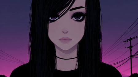 A woman with long black hair and purple eyes gazes thoughtfully, standing in front of a sunset with colorful skies and telephone poles in the background. The scene captures a moment of serene beauty.