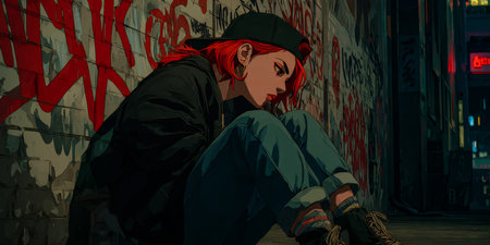 In a vibrant urban alley at night, a young woman with red hair sits against a wall covered in colorful graffiti. Neon lights glow in the background, creating a moody atmosphere.