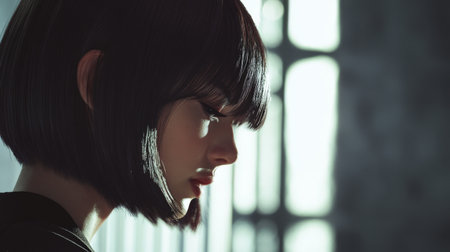 A detailed shot of a woman with a chic, modern bob haircut, showcasing the sleek and polished finish, with a focus on the sharp lines and healthy shine of the hair.