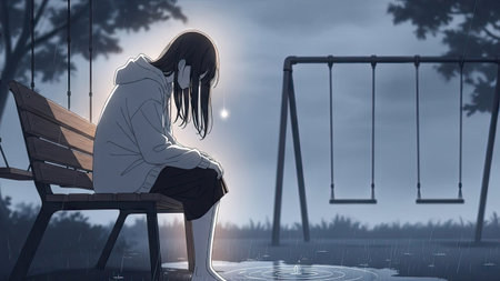 An illustration depicts a solitary woman seated on a wooden bench. The scene showcases a melancholic atmosphere with muted tones, featuring a swing set. The lighting suggests an evening or overcast day. This image is suitable for various editorial and commercial applications, including articles and website designs.