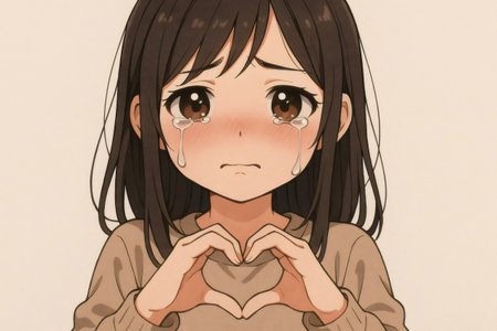 Sad anime girl crying while forming a love sign with her hands, deeply expressing heartfelt emotions of sorrow and longing