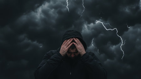 A man in a black jacket with a hood on his head is standing in a thunderstorm.