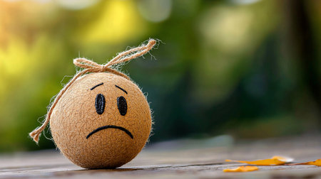 A close-up of a small, textured, light brown spherical object with a hand-drawn sad face and a rustic string loop at the top, resting on a wooden surface.