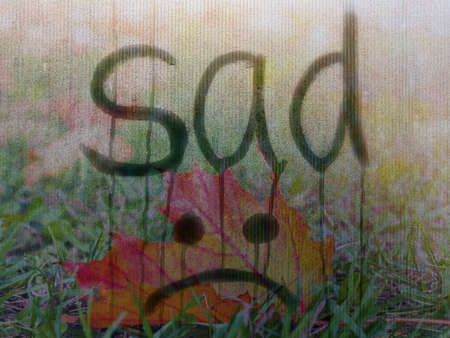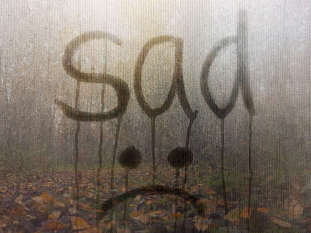 Written by sad and Emoji on blue misted glass. Autumn, longing, loneliness, problems concept