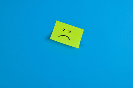 Green sticky note with a sad face on a bright blue background, conveying a contrasting mood through minimal design.