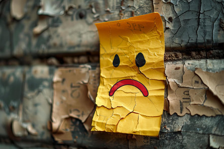 Yellow sticky note with sad face on red background, conveying emotions through bold color contrast and minimal design.