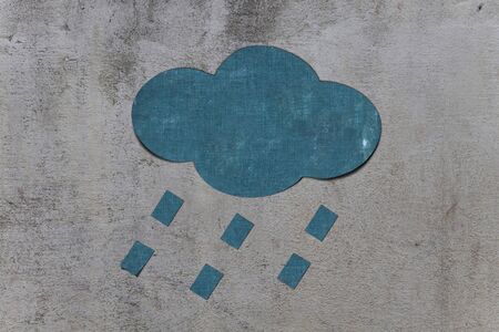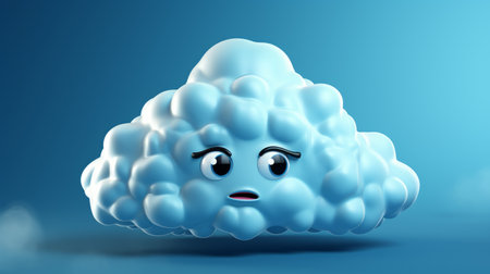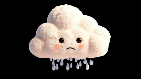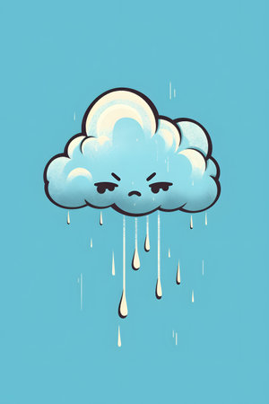 A blue, cartoon cloud with a sad face sits on a dark blue surface, covered in raindrops
