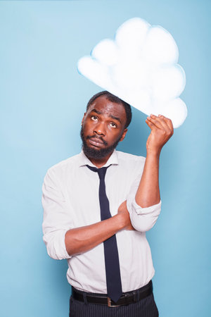 Portrait of male entrepreneur in white shirt looking up at white paper idea cloud brainstorming while standing in front of blue background. African American man thinking under thought bubble.