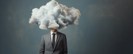A man with his head in a foggy cloud. Theme of depression, loneliness and mental health.