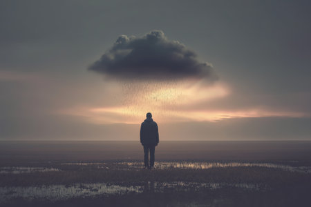 surreal conceptual image of a man standing under a single rain cloud in a wide open field at sunset. the scene symbolizes depression, loneliness, and emotional struggle.