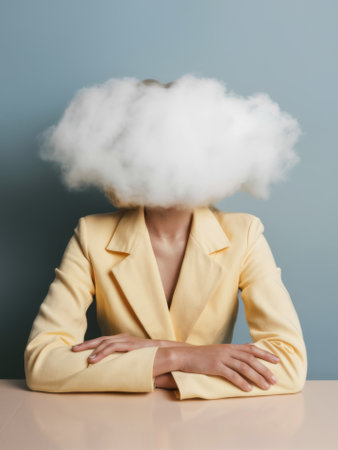 A surreal scene depicting a woman in a yellow blazer with her head transformed into a fluffy cloud. the blue background contrasts with the imaginative concept.