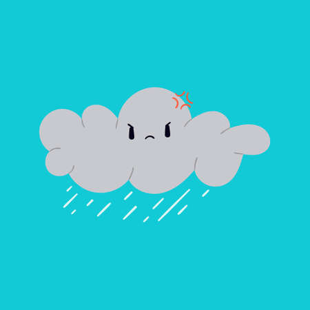 A sad-looking rain cloud with raindrops falling from it against a dark, stormy sky